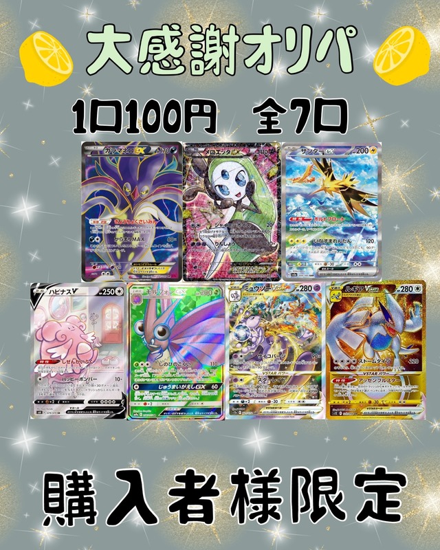 大感謝オリパ.14 ご覧いただきありがとうございます*・゜゚・*:.。..。.:*・'・*:.。. .。.:*・゜゚・* 数あるお店の中から当店を選んでいただきありがとうございます。 大感謝オリパは月はじめに販売しておりましたが来月お休みをいただきますので今月は商品販売最終日の本日14日販売になりましたo(≧▽≦)o 2週間と期間は短かったですがたくさんの応援いただきました。ありがとうございますm(_ _)m 感謝の気持ちを込めて大感謝オリパを作成しました٩( 'ω' )و楽しんでいただけたら嬉しいです♪ 今回のオリパは8月1日〜8月14日までに当店での購入金額10000円以上のお客様限定です。(送料込の金額) ご購入されていない方の注文はキャンセルさせていただき商品を戻させていただきます。 まだまだ至らない点もあるかと思いますがよろしくお願いいたします。何かご不明な点がございましたらご連絡ください。 【商品説明】 ●作成日8/13 ●1口100円(税込) ●送料400円(梱包資材料込) ●全6口 ●画像確定 ●購入制限1人1口まで ●コンビニ払い不可 ▶︎▷今回のオリパは当店状態A-も封入しています 完美品ではないことをご了承ください 【発送方法】 ヤマト運輸のネコポスにて 追跡番号付きで発送いたします 【注意事項】◀◁必ずご確認ください 当店の商品をご購入頂いた方は注意事項を 全て確認し内容に同意頂いたと判断いたします ●商品の性質上当たり外れがございますので内容に関する評価は必ずお控えください 不当なレビューを記載された場合然るべき対応を取らせて頂く場合がございます その点をご理解していただいた上で購入お願いいたします ●一定期間で完売とならなかった商品は予告なしに終了する場合がございます ●発送後の事故は保証致しかねます ●入金確認後1日~3日以内に発送いたしますが、大型連休、災害等で遅くなる場合がございます ●商品購入後のお客様都合のキャンセルは受け付けておりません ●その他ご要望もできる限りではございますが対応させていただきます(まとめ買い、梱包など) 【納品書について】 当店では納品書を同梱しておりません ご希望の方はお手数ではございますが注文時の備考欄にお願いいたします 【お願い】 ●お店のフォロー、お気に入り登録してくれると嬉しいですꔛ ●YouTubeやXなどのSNSでの開封報告大歓迎です ●完売、販売終了までトップ当選のBASEレビュー、SNS等での投稿は控えていただけると幸いです ●完売後、販売終了後トップ当選のレビューしていただけたら嬉しいです その他ご質問等ございましたらメッセージでお気軽にお問い合わせください☆*:.。. .。.:*☆