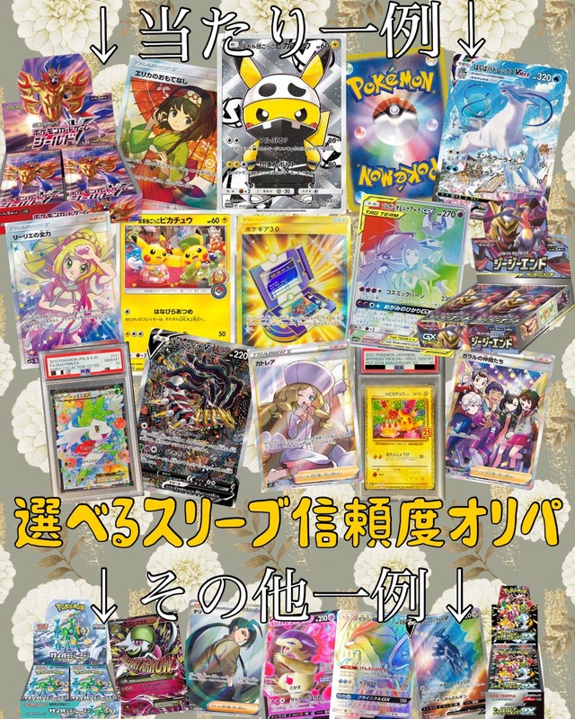 選べるスリーブ信頼度オリパ ご覧いただきありがとうございます*・゜゚・*:.。..。.:*・'・*:.。. .。.:*・゜゚・* 数あるお店の中から当店を選んでいただきありがとうございます。 スリーブによって当たり信頼度が違う!しかも選べるオリパです٩( 'ω' )و 前回よりパワーアップ✌︎('ω'✌︎ ) 信頼度は画像2枚目をご覧ください。 好きなキャラクタースリーブを選ぶも良し! 信頼度で選ぶも良し! 信頼度は画像の当たり一例と載せていない複数のシークレットが封入されている確率になります。 全56口被りなし! 今回もシークレットを楽しんでいただきたいのでいつものように全口公開はしておりません。 当たり一例、その他一例を公開しております。 種類を選択のところにスリーブ名が記載されているので選択してご購入ください。 ご不明な点がございましたらお問い合わせください。 まだまだ至らない点もあるかと思いますがよろしくお願いいたします。 【商品説明】 ●作成日4/9 ●1口7777円(税込) ●送料500円(梱包資材料込) ●全56口 ●1度の購入5口まで (総購入数に制限はございません) ▶︎▷エリカのおもてなしとリーリエの全力とポケギアは当店状態A-として封入しています 【発送方法】 ヤマト運輸のネコポスor宅急便コンパクトor宅急便にて追跡番号付きで発送いたします 【注意事項】◀◁必ずご確認ください 当店の商品をご購入頂いた方は注意事項を 全て確認し内容に同意頂いたと判断いたします ●商品の性質上当たり外れがございますので内容に関する評価は必ずお控えください 不当なレビューを記載された場合然るべき対応を取らせて頂く場合がございます その点をご理解していただいた上で購入お願いいたします ●できるかぎり状態の良いカードを封入するように努めておりますがあくまで中古品です 当店基準で許容範囲のカードを封入しておりますがいずれも完美品ではないことをご了承ください ●一定期間で完売とならなかった商品は予告なしに終了する場合がございます ●発送後の事故は保証致しかねます ●入金確認後1日~3日以内に発送いたしますが、大型連休、災害等で遅くなる場合がございます ● 商品購入後のお客様都合のキャンセルは受け付けておりません ●その他ご要望もできる限りではございますが対応させていただきます(まとめ買い梱包など) 【再シュリンク補償について】 当店では直接購入したもの、信頼できるお店から購入させていただいたものを封入しております ですが万が一再シュリンク品だった場合には、ダンボール開封時からの動画がある場合のみ返金対応させていただきます 【納品書について】 当店では納品書を同梱しておりません ご希望の方はお手数ではございますが注文時の備考欄にお願いいたします 【お願い】 ●お店のフォロー、お気に入り登録してくれると嬉しいですꔛ ●YouTubeやTwitterなどのSNSでの開封報告大歓迎です ●完売、販売終了までトップ当選のBASEレビュー、SNS等での投稿は控えていただけると幸いです ●完売後、販売終了後トップ当選のレビューしていただけたら嬉しいです その他ご質問等ございましたらメッセージでお気軽にお問い合わせください☆*:.。. .。.:*☆